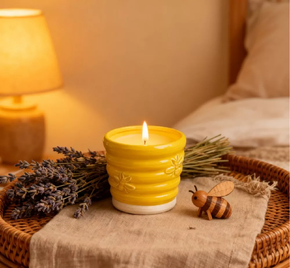 Теглата со керамички свеќи на BYF е слатка средба помеѓу пчелите и керамиката. Ние го обликувавме буцкастото тело на оваа тегла од мека, мазна керамика, украсувајќи го со живи пчелни релјефи и мали цветови - како штотуку да собрале нектар и да се одмораат на светлината на свеќата. Кога свеќата е запалена, ореолот од светлина се филтрира низ медената глазура, фрлајќи сенки што се нишаат на ѕидот, а целата соба шепоти топла мала песна.