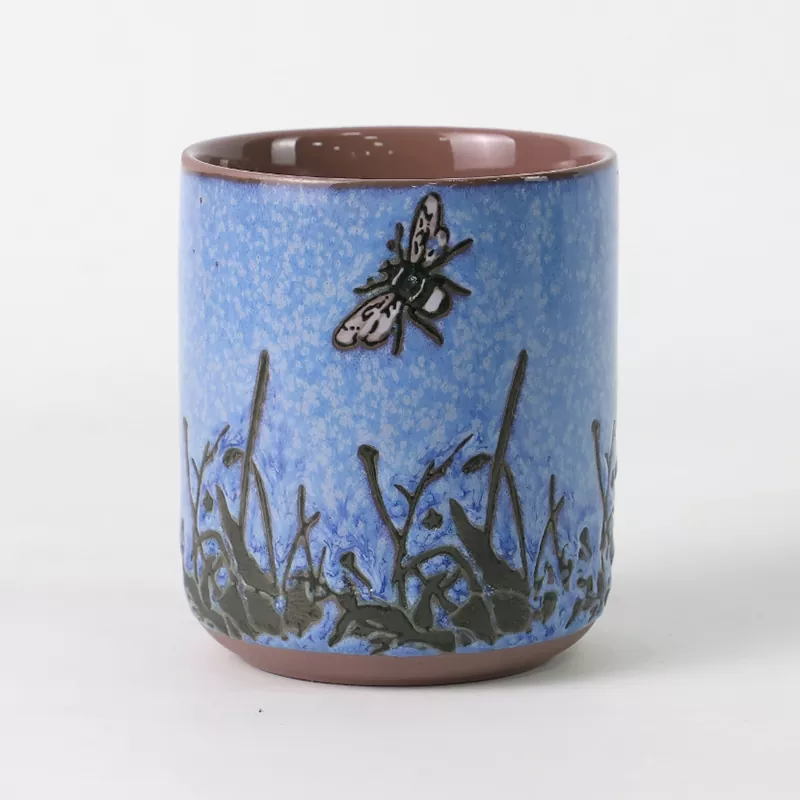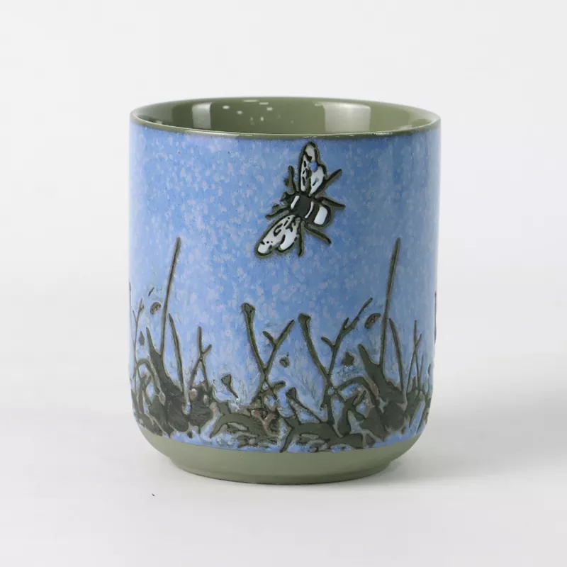Серијата Керамички држачи за свеќи со модел на инсекти црпи инспирација од природните слики на „Симбиозата на Кордицепс“, доловувајќи ја суштината на класичната источна естетика и мистичната убавина на ѕвезденото небо. Соединува глазура на висока температура од печка со рачно насликана долна глазура, претрпувајќи десетици прилагодувања и подобрувања за на крајот да создаде три препознатливи бои: Ѕвездена ноќна сина, мистична зелена и длабоко индиго. Надворешниот ѕид на чашата наликува на огромно ѕвездено небо посипано со фини златни флеки, како сјајот на Млечниот Пат да се држи на вашата дланка; внатрешниот ѕид користи чиста глазура, јасна како огледало, создавајќи силен визуелен контраст со текстурата на ѕвезденото небо однадвор, покажувајќи генијалност во интеракцијата на светлината и сенката. Рачно насликани шаблони на пеперутка, стебло трева и глуварче на дното, прецизно изработени од искусни занаетчии, се живи и живописни, навидум раскажуваат вечна приказна за циклусот на животот и симбиозата на природата. Секоја чаша е уникатно уметничко дело, отелотворувајќи почит кон природата и прослава на животот.