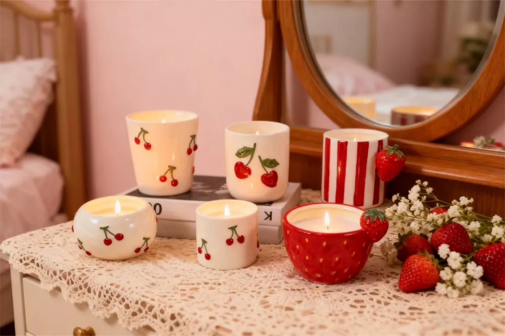 Светло-црвениот мотив од цреша и зелен лист пренесува класична и радосна слатка атмосфера. Уникатната, тридимензионална рачка во форма на јагода и дизајнот на теглата додаваат живо тактилно чувство, стимулирајќи силна желба кај клиентите да ја поседуваат. Елегантните црвени или розови пеперутки јазли го красат дизајнот, давајќи му на производот префинет квалитет на подарок и романтичен стил. Изработена од висококвалитетна рачно изработена керамика, глазурата е топла и мазна, истакнувајќи ја врвната мат текстура. Поседува одлична отпорност на топлина и стабилност, обезбедувајќи безбедно согорување и е совршено компатибилен со вообичаените восочни основи како што се восок од соја и пчелин восок.